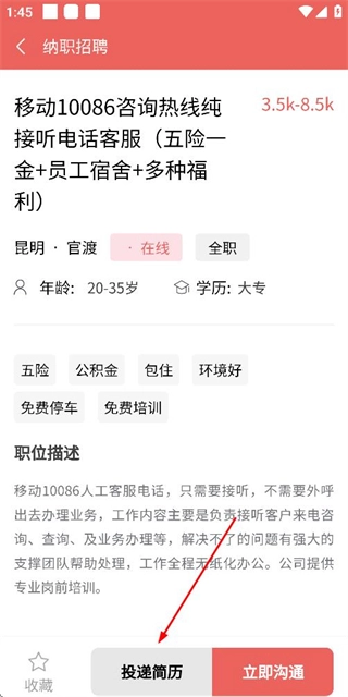 在职位详情页点击“投递简历”按钮,即可完成该职位的简历投递流程。