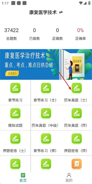 在康复医学技术首页找到历年真题选项并点击,即可进入历年真题页面。
