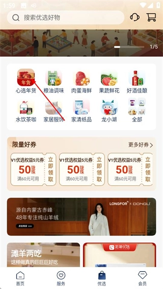 在优选页面,点击“心选年货”分类,就能进入到对应的商品列表页面。