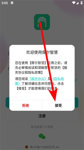 打开摩尔智慧应用,当出现“欢迎使用摩尔智慧”的弹窗时,点击“接受”按钮。