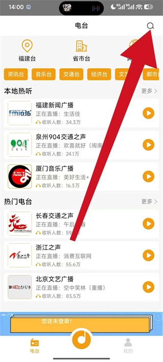 在电台主页面的右上角,点击搜索按钮,即可进入电台搜索界面。