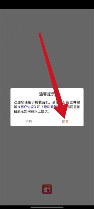 打开手机收音机应用,待弹出相关弹窗后点击“同意”按钮,即可进入电台主页面。