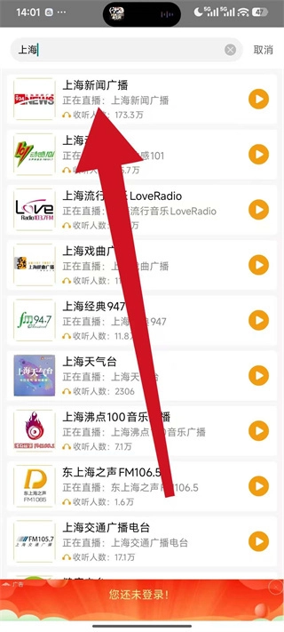 在搜索结果列表里,点击目标电台所在的对应区域,就能开始收听该电台的节目了。
