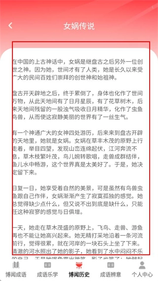 在女娲传说的详情页面里,能够查看这个传说的完整故事内容。