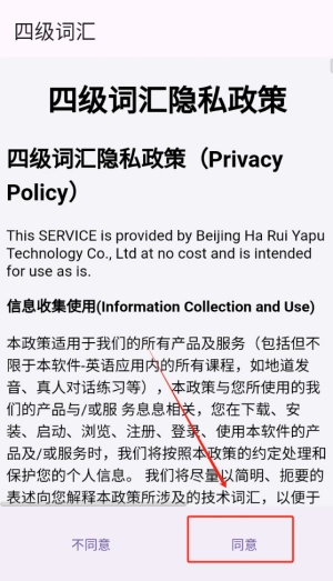 点击同意按钮进入应用,在接受相关条款后顺利进入学习界面,准备开启词汇学习之旅。