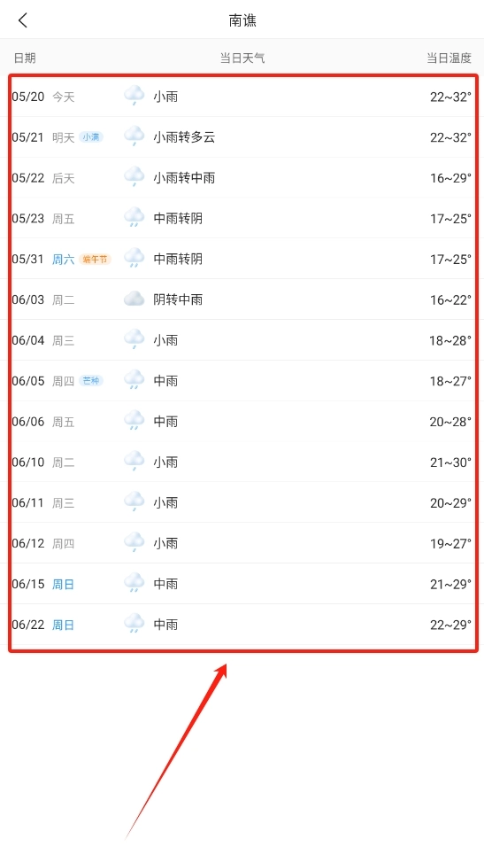 现在屏幕上呈现的正是未来40天内的降雨日期,哪天需要带伞一目了然。