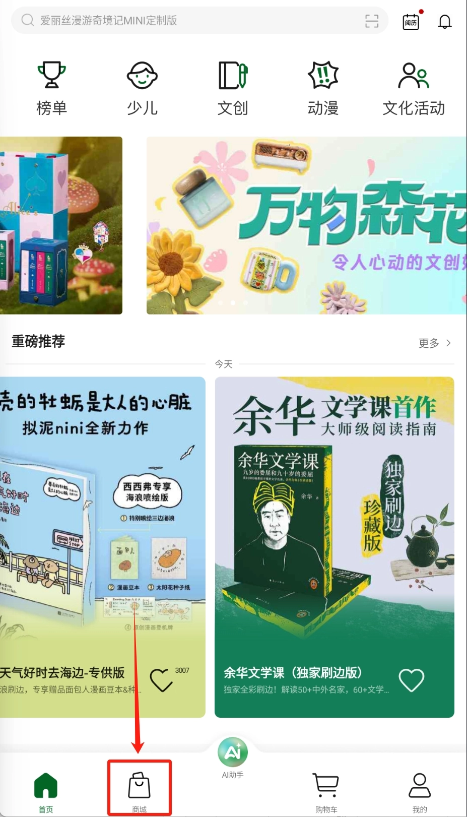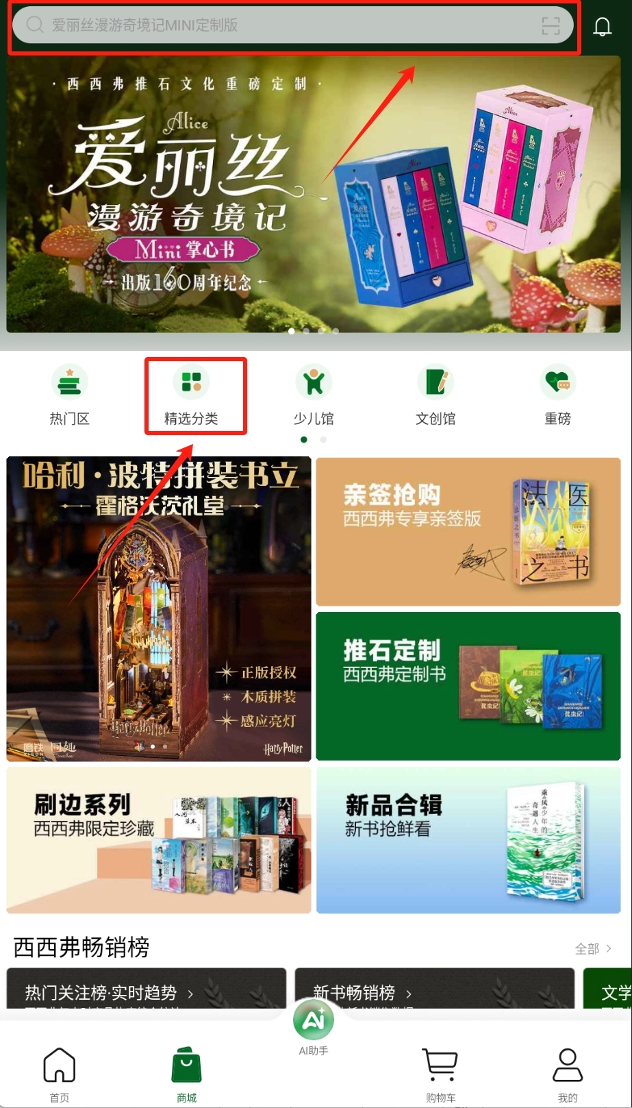 进入商城后,你可以点击顶部的搜索栏来查找心仪的书籍,也能通过分类导航进行筛选查找。