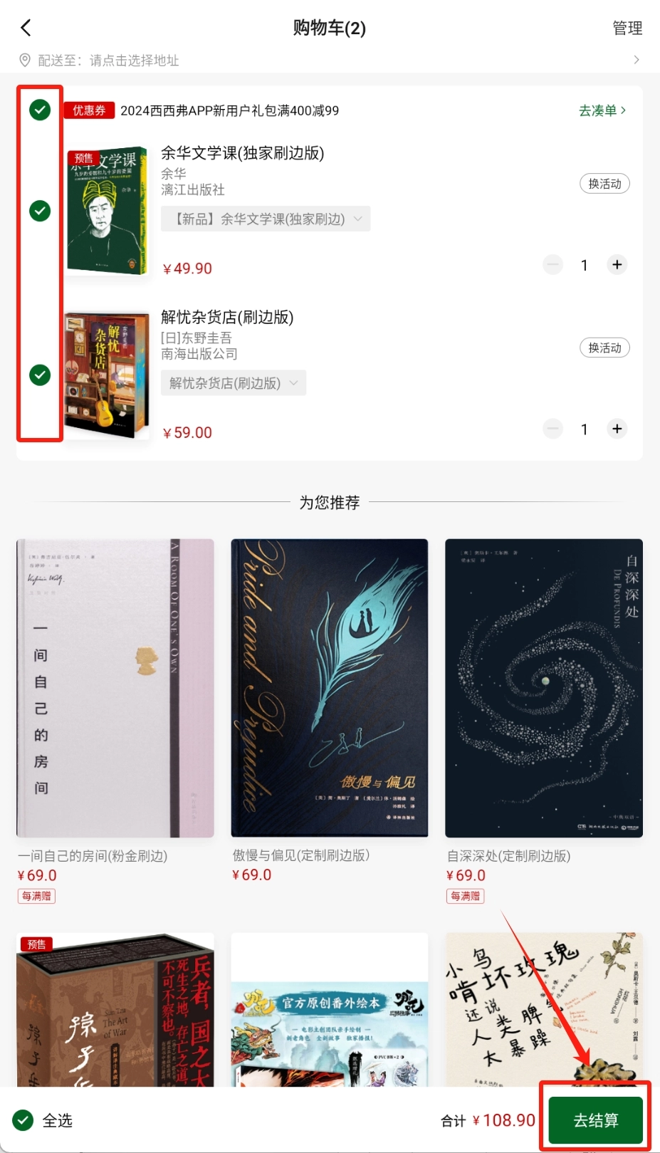 选购完成后,进入购物车页面,进行结算。
