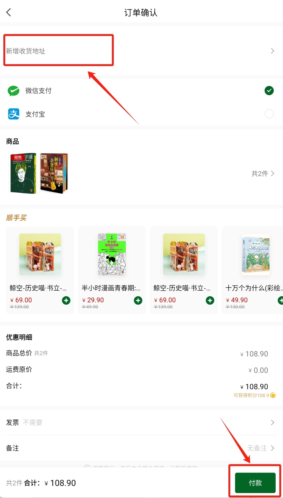 在订单确认页面,填写收货地址,然后付款即可。