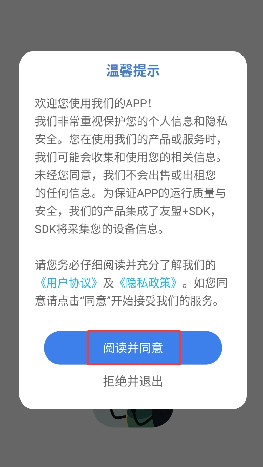 首次启动应用时,会弹出用户协议窗口,点击“同意”按钮就能进入主界面。