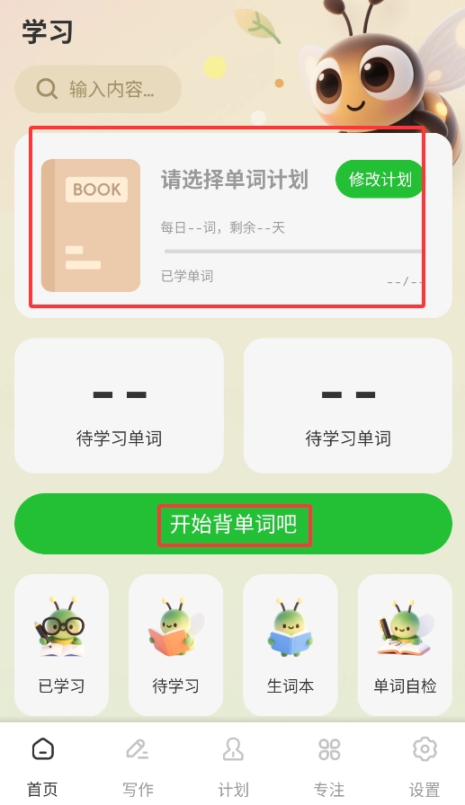 首页设有单词计划修改功能,点击“开始背单词”按钮就能进入学习模式。
