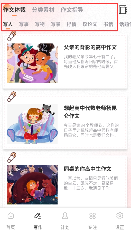 写作板块涵盖了多样的作文体裁、各类素材以及写作指导等实用内容。