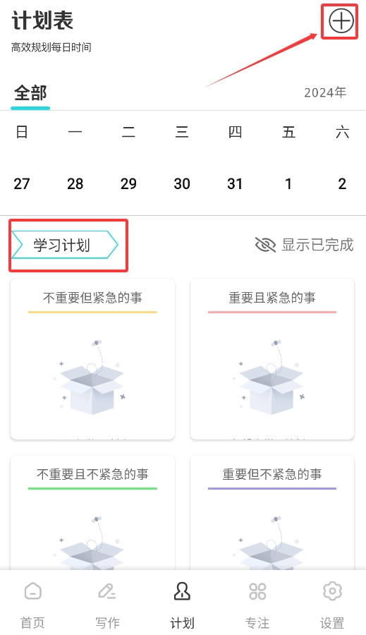 在计划页面能够查看学习进度,点击右上角的“+”号就能创建新的学习计划。