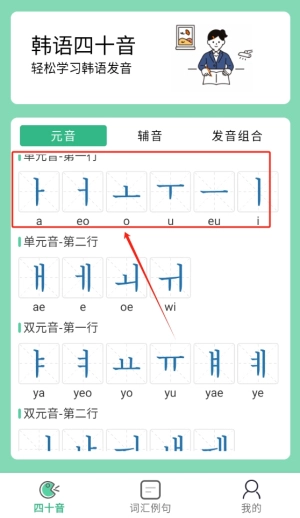 韩语四十音的动图笔顺教学能够引导用户学会正确的书写方法,点击字母就能听到对应的发音。