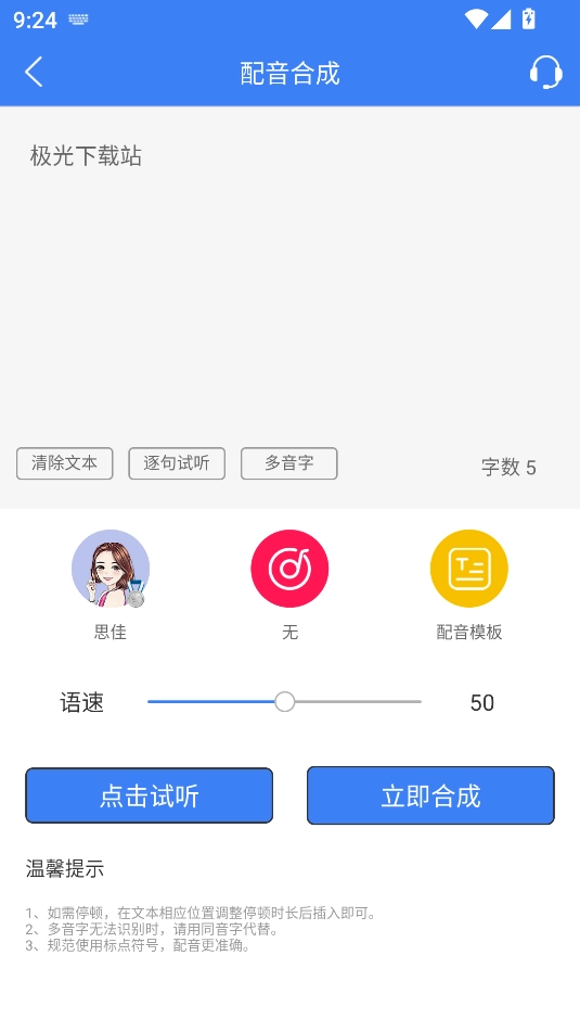 智能合成功能:借助AI技术实现文字秒速转语音,男女童声均可一键生成,语速与音调支持灵活调节。