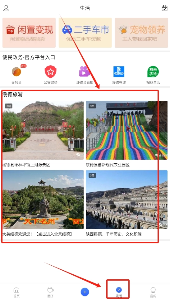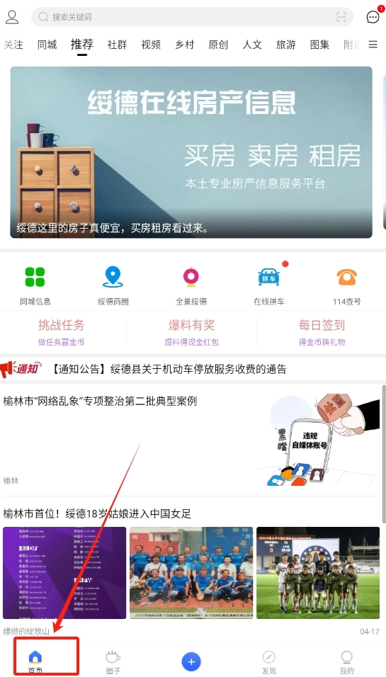 打开绥德在线,首页推荐的本地新鲜事即刻映入眼帘,各类公告以及街坊们发布的帖子都汇集于此。