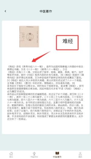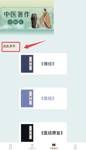 启动应用后,在主页面的菜单栏里找到“中医著作”功能按钮并点击进入。