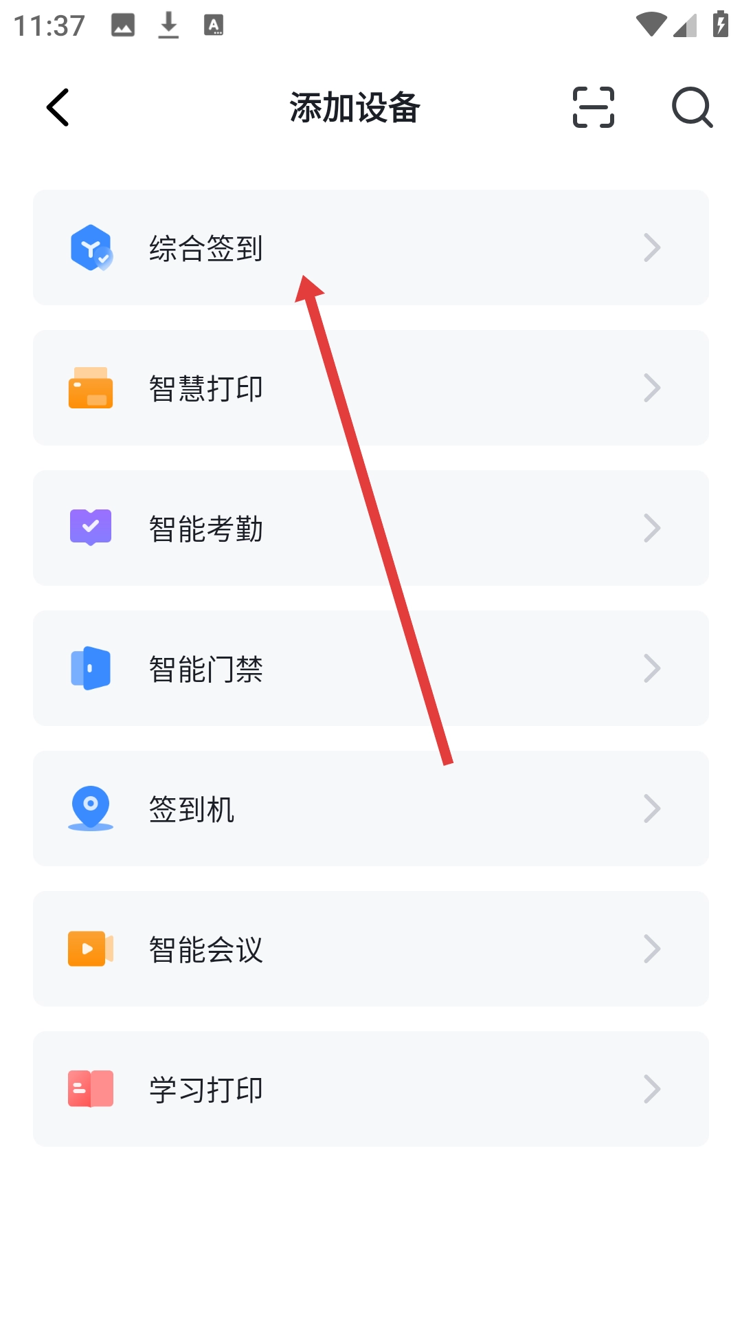在添加设备页面点击【综合签到】选项,即可进入综合签到设备的列表页面。