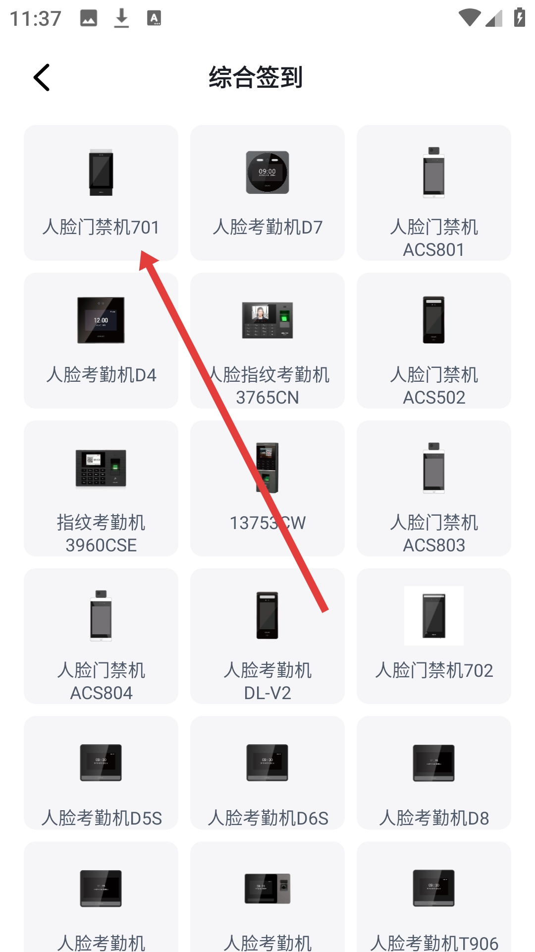 在综合签到设备列表页面,点击【人脸门禁机701】,即可进入添加设备的操作页面。