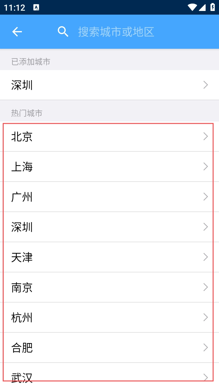 打开应用进入首页后,点击顶部的【添加城市】按钮,即可进入城市添加页面。