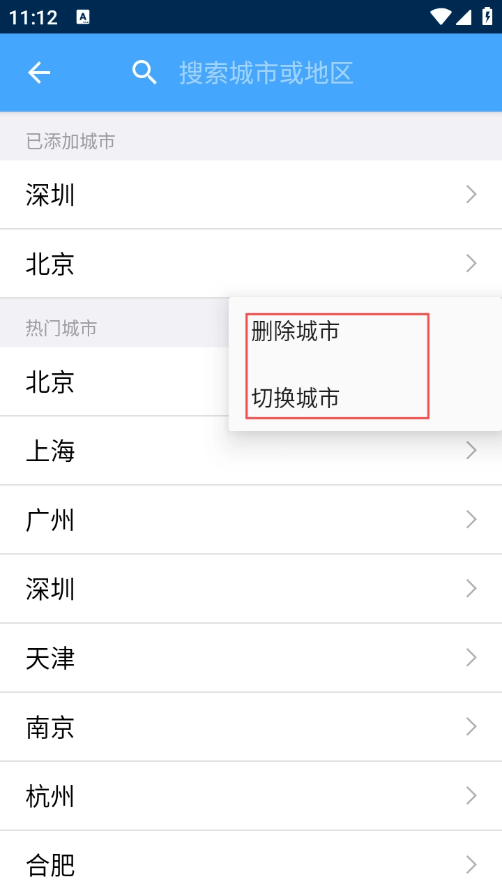 若需管理已添加的城市,长按城市条目,即可进行【删除城市】或【切换城市】操作。