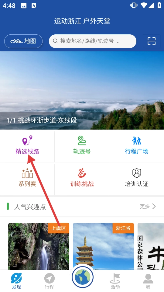 进入发现页面后,点击页面上的【精选线路】选项,即可进入行程搜索页面。