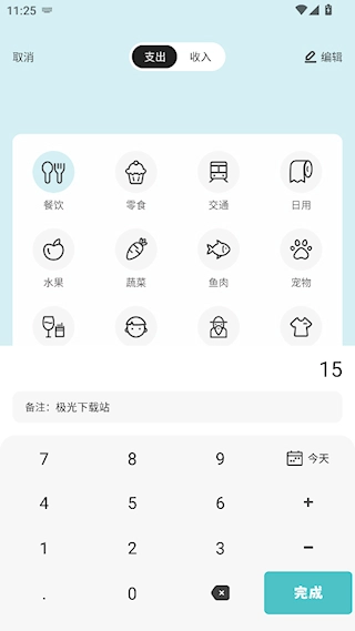 选择类别后,输入金额与备注,点击完成