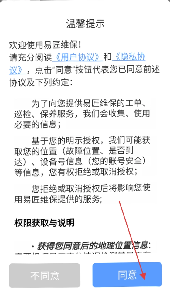 首次启动应用时,在弹出的【温馨提示】窗口中点击【同意】按钮,即可进入引导页面。