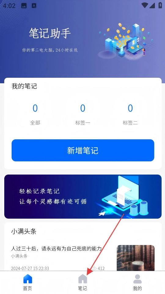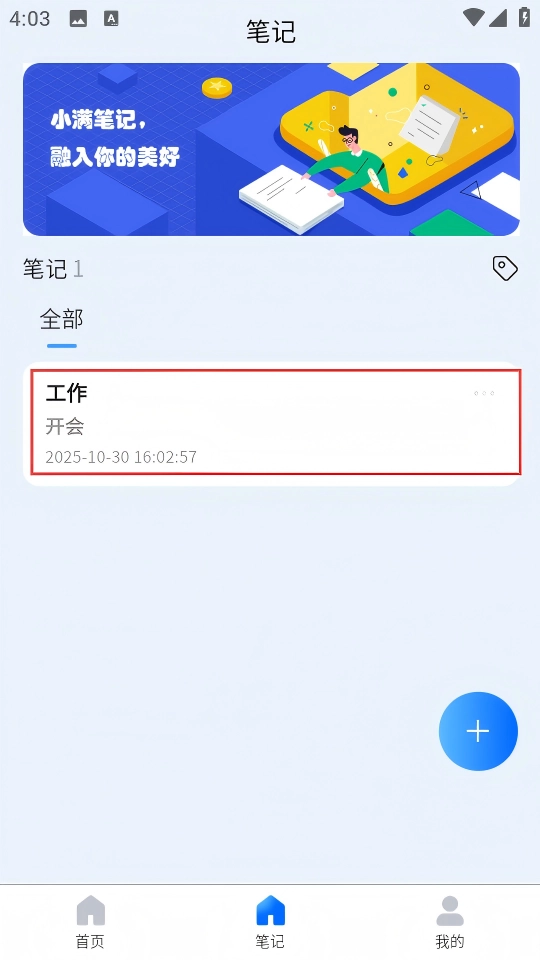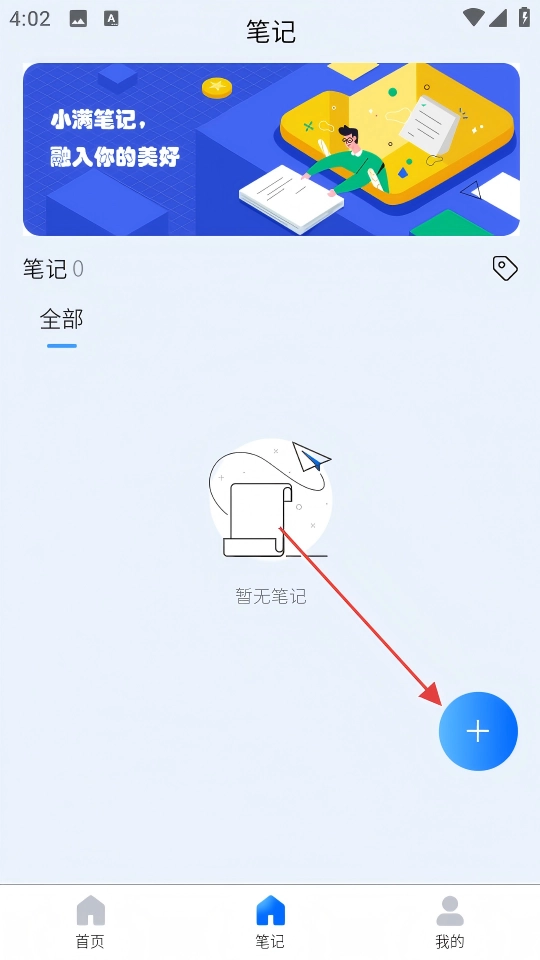 在笔记页面点击蓝色的【+】按钮,即可启动新增笔记的操作。