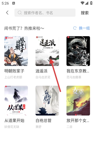 在搜索页面,能看到热推书籍(例如《逍遥派》),点击想要的书籍就能进入书籍详情页。