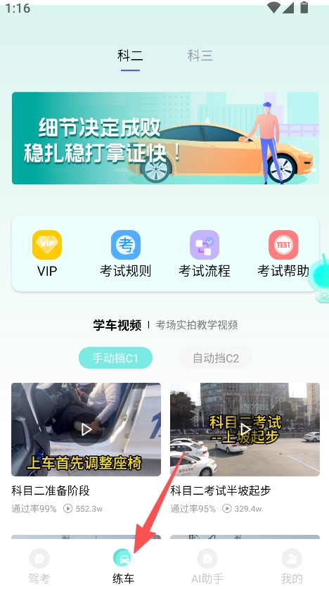 点击练车板块,选择科目二或科目三,即可查看考试规则、流程以及帮助等相关内容。