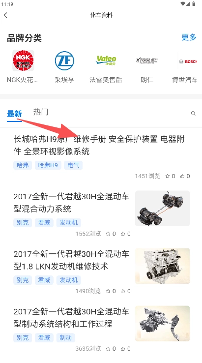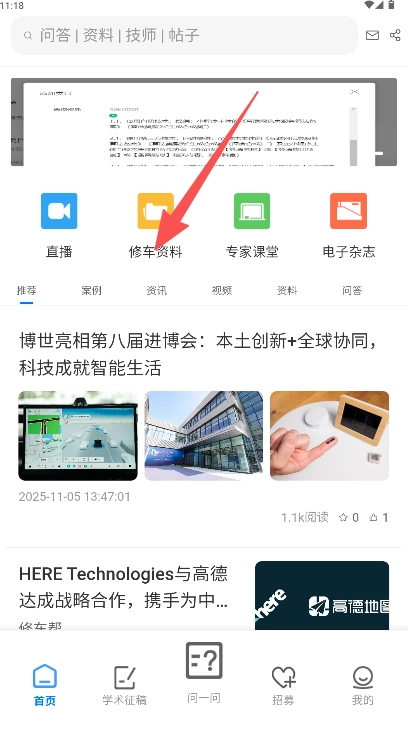 在首页点击“修车资料”按钮进入资料库。