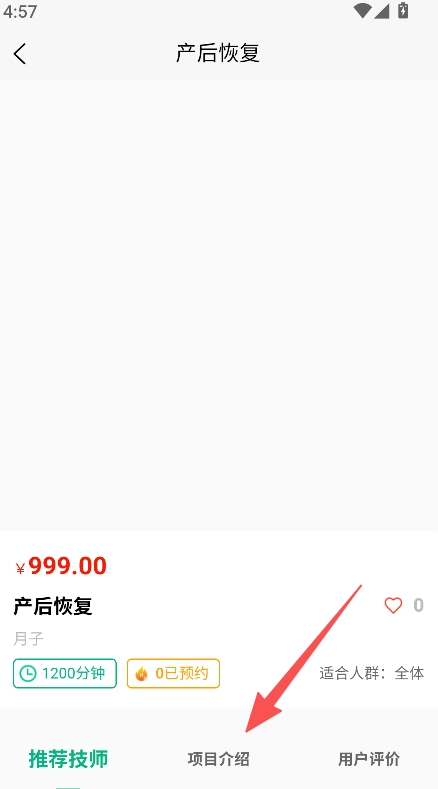 项目详情查看功能支持用户进入具体项目页面(例如产后恢复项目),在此页面中,用户能够查看该项目的价格、服务时长、详细介绍以及推荐的技师信息,从而对服务内容进行全面的了解。