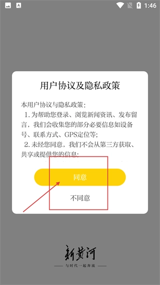 在新黄河启动时,点击“同意”按钮以接受用户协议与隐私政策,从而进入使用流程。