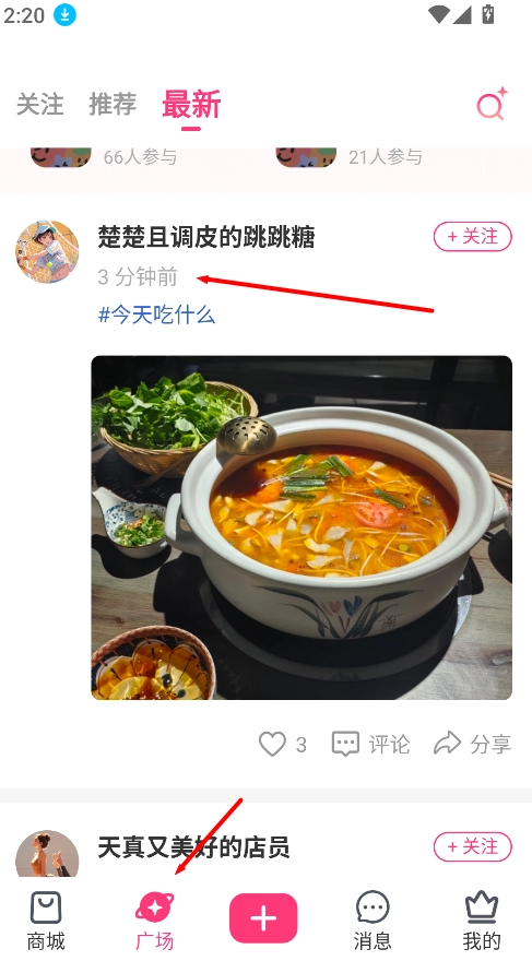 点击“广场”页面即可浏览最新的用户动态,获取美妆穿搭、生活分享、健康心得等丰富多元的内容。