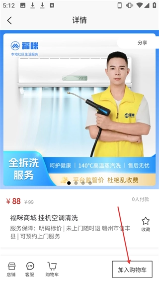 在分类页面点击【福商城挂机空调清洗】服务条目,就能进入该服务的详情页面。