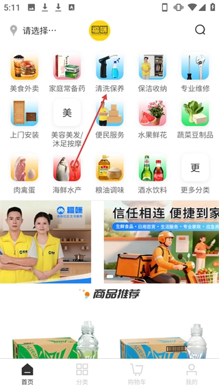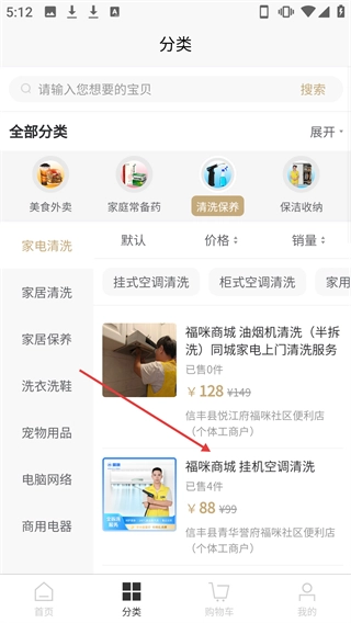在首页点击【清洗保养】分类选项,就能进入清洗保养类服务的分类页面。