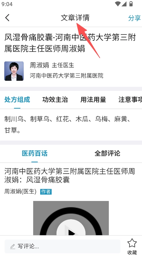 展示医生的相关信息,涵盖其所在医院、职称等内容,以此明确药品讲解所依托的专业医疗背景,并从专业维度对信息进行补充。