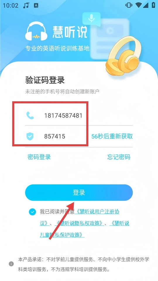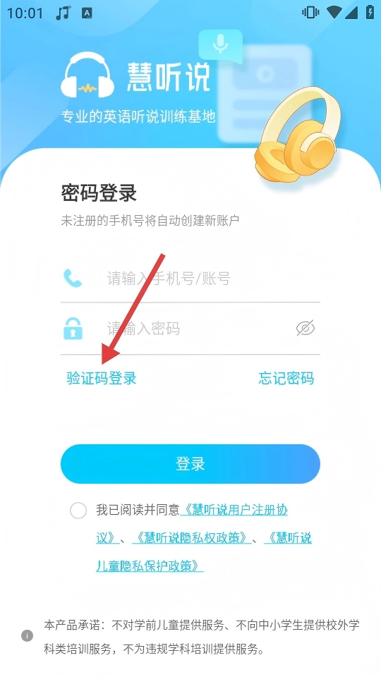 在验证码登录页面填写手机号与验证码,勾选同意相关协议后点击【登录】按钮,即可完成登录流程。