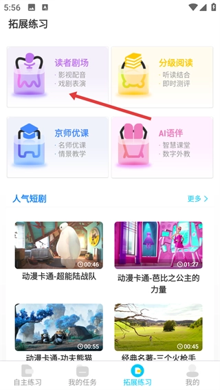 进入拓展练习页面后,选择【读者剧场】功能,就能进入对应的板块啦。