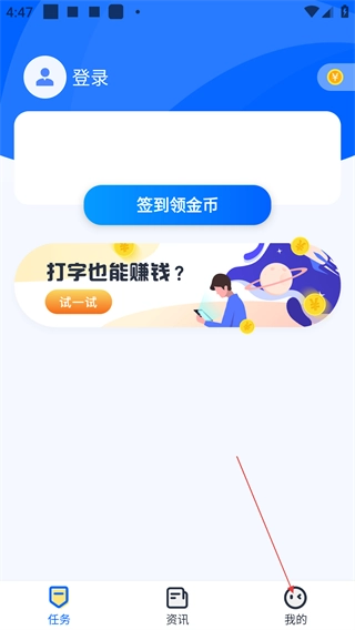 进入界面后,点击【签到领金币】即可获取奖励,个人中心可通过底部的【我的】入口进入。