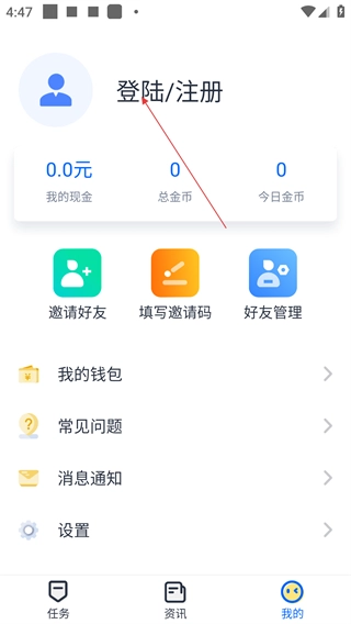 在【我的】页面,可通过【邀请好友】【填写邀请码】等功能来管理社交关系,点击【登录】按钮即可进入登录界面。