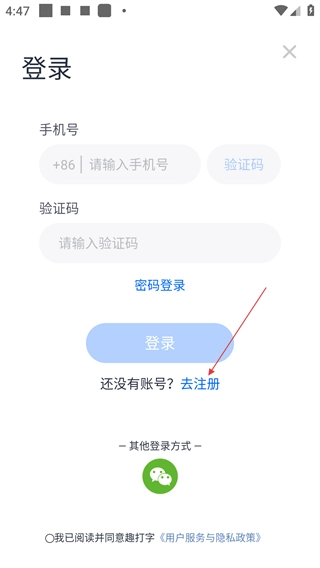 登录界面提供多种登录选项,你可以选择【手机号-验证码】的方式快速登录,也能通过【密码登录】或【其他登录方式-微信】进行操作;如果还没有账号,点击【去注册】即可创建新账号。