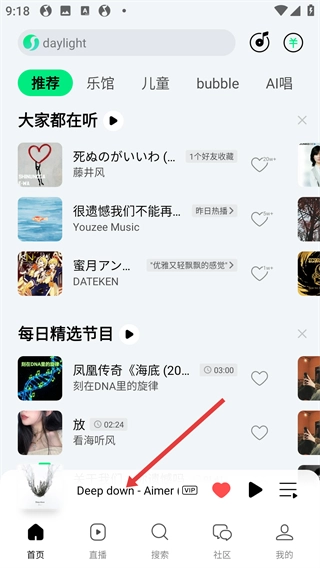打开QQ音乐应用后,找到底部播放栏中显示的【Deep-down-Aimer】并点击,即可进入该歌曲的播放界面。