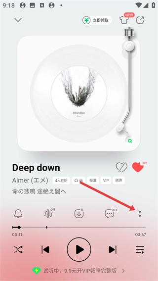 在【Deep-down】的播放界面,点击右侧的两点按钮,就能展开更多操作选项。