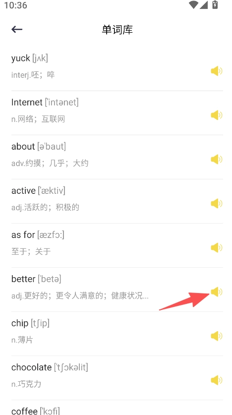 支持单词库学习功能,进入相应页面后,能查看单词的音标、词性和释义,点击发音按钮即可收听单词的读音。