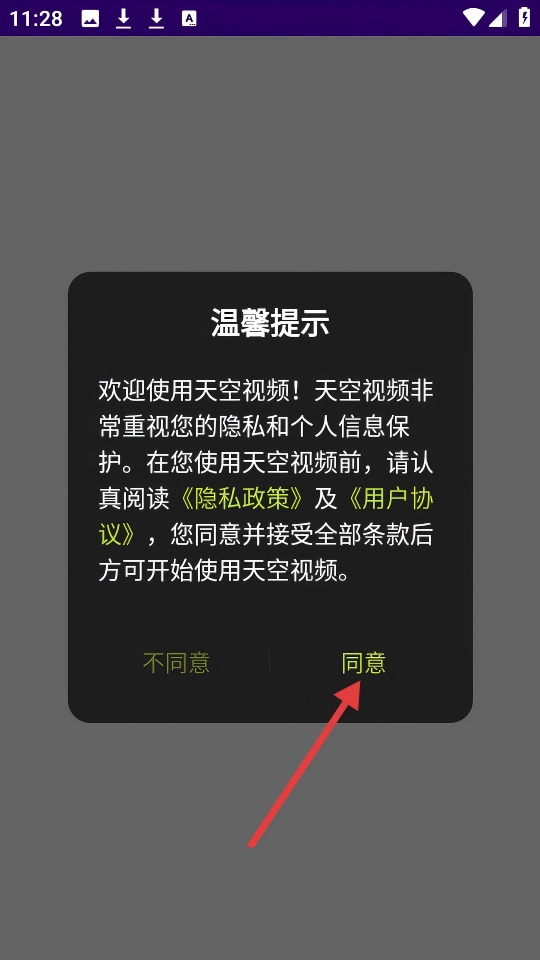 在弹出的窗口里,点击【同意】按钮,以此接受《隐私政策》和《用户协议》,随后即可开启使用。