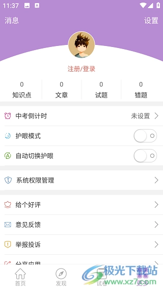 用户能够在“更多”选项里进行中考倒计时时间的设置、开启自动护眼模式以及分享应用等操作。