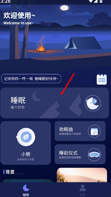 打开软件后,进入“睡眠”板块,进入助眠设置页面。