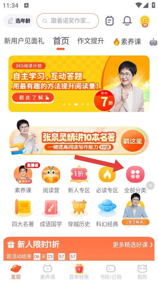 打开少年得到后进入首页,点击【全部分类】,从中查找自己感兴趣的课程类别。